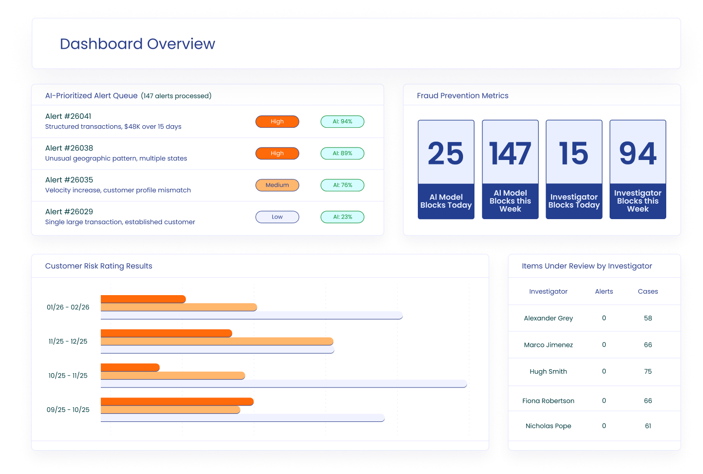 Skylight’s fraud dashboards give your team at-a-glance views of program performance, suspicious activity trends, and analyst productivity with the flexibility to build custom visualizations specific to your operation.